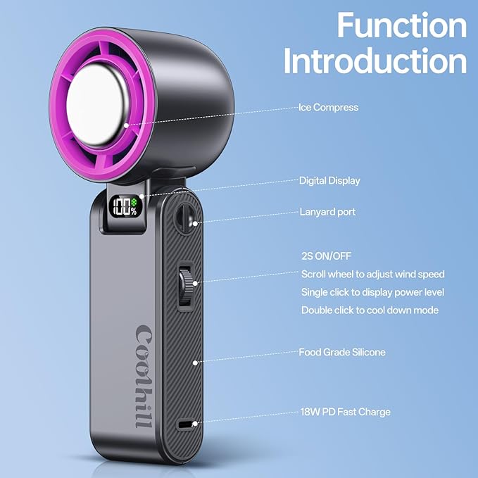 - Coolhill Ultra-Fast Cooling - 100-Speed Ice compress technology cooling with 20'F drop! Features an advanced 6-blade design paired with a high-speed three-phase brushless motor, delivering a maximum wind speed of 30ft/s - 2x faster than traditional hand held fans! With a 20000 rpm maximum speed, it instantly blows away the heat