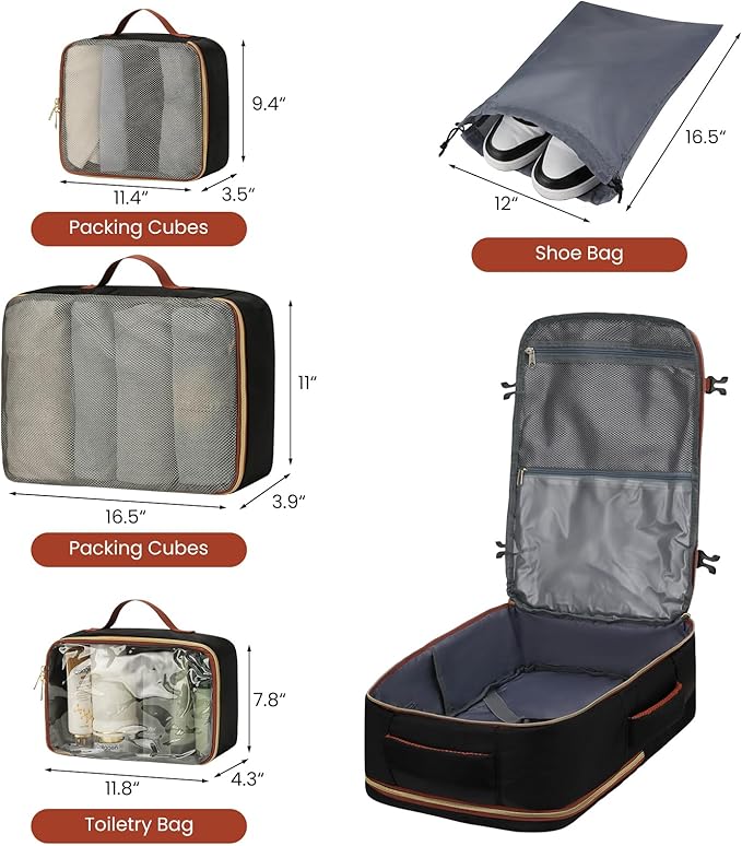 - 【4 Extra Packing Cubes for Storage】Comes with4 extra packing cubes, this personal item travel bag offer enough space for storing clothes, toiletries and your shoes. And the built-in wet compartment of the backpack prevent any leaks or moisture from affecting your other personal items.