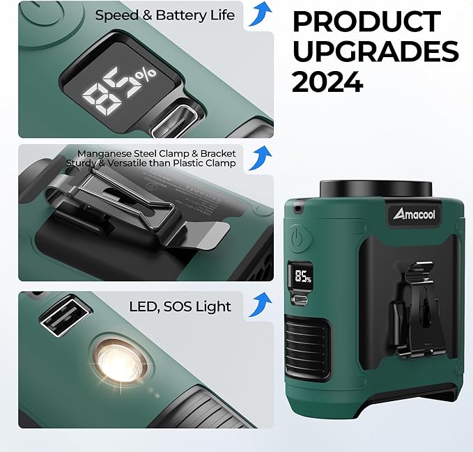 - 40H Max Running: AMACOOL waist clip fan is designed with buyer's needs in mind, providing up to 40 hrs of continuous airflow at wind speed 1 with the 10000mAh built in battery, it lasts up to 8 hrs even in the strongest speed, greatly reduces the number of recharges, LED display let you know when to charge; Feature with a 5V-2A USB output port to charge your phone in emergency