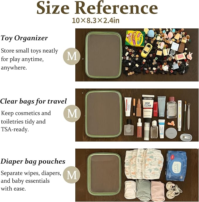 - Multi-Use Storage for Daily Essentials. Perfect as a bag organizer for makeup, toiletries, charging cables, pens, or travel-size items. Whether at home or packing a diaper bag, these clear zipper pouches help sort small items with ease.