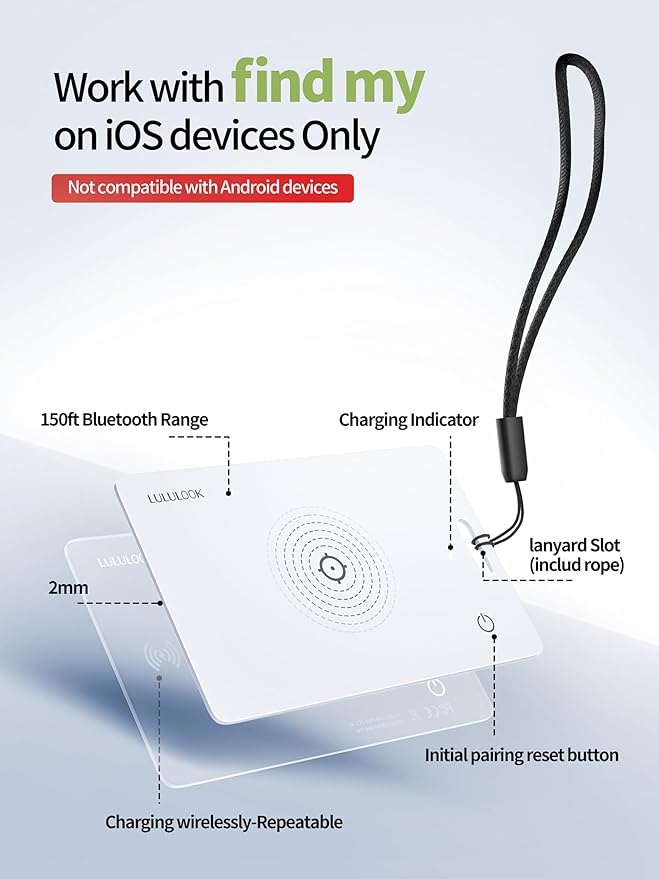 LULULOOK Wallet Tracker Card (iOS Only), Ultra Slim Airtag Wallet Works with Apple Find My, Wireless Rechargeable GPS Smartcard Tracker for Luggage, Tags, Passport, Purse, IP68 Waterproof, 1 Pack