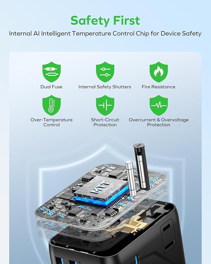 - SAFETY TRAVEL PLUG ADAPTER - Built-in 10A dual fuse for overload & short-circuit protection. It does not have surge protection and can be conveniently used on a cruise ship as well. Built-in 10A fuse, safety shutters, RoHS, CE, and FCC certifications, and our warranty provide extra peace of mind. [Please note that our adapter does NOT convert voltage]