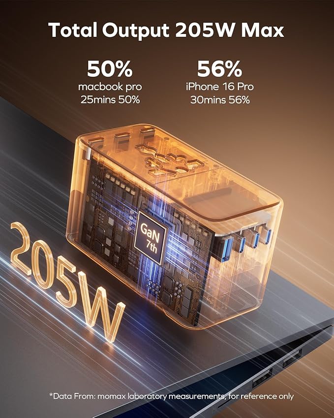 - 205W All-IN-ONE TRAVEL ADAPTER - Concentrated 205W Power into 9 Ports, one momax UA28 equals three international power adapter: 140W+45W+20W combined capacity. Advanced Stacking & GaN technology for massive power in a mini body, while adding more ports, speeding up charging and reducing temperatures. This universal plug adapter saves space in your suitcase and handbag, whether navigating European, Asian cities