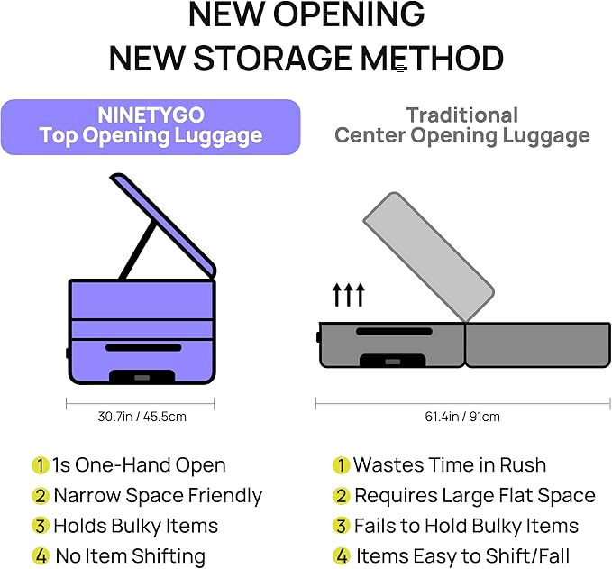 - 【Instant Access & Smart Expandable System】Revolutionary top-opening design enables 1-second, one-handed access to belongings without fully unpacking—a game-changer over traditional clamshell suitcases that require flat, open space. The smart expandable zipper effortlessly adds extra capacity for vacation shopping or seasonal packing.