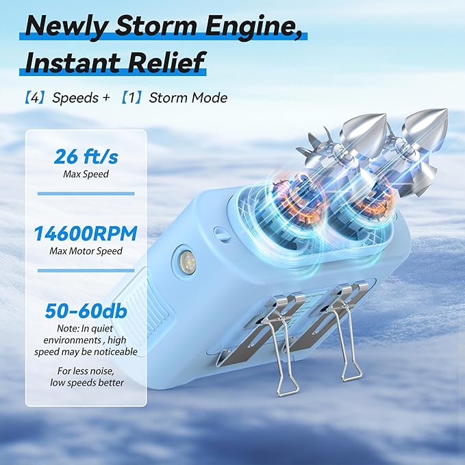 - 2025 Fully Upgraded: AMACOOL portable waist clip fan is the flagship product born from relentless pursuit of excellence and user feedback; It is the first to employ Instant Cool Relief Storm Mode and is built with cutting-edge dual-motor and dual air outlet design, ultra high-speed motor, certified 14,500mAh rechargeable battery; digital display, silicone protective cover, and durable manganese steel clip, delivering an unprecedented, immersive cooling experience like never before. "No Standalone lithium batteries are sold with the product"