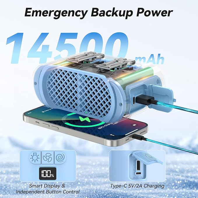 - Long-Lasting & Endless Reassuring: This personal wearable fan equipped with certified 14500mAh rechargeable battery that provides up to 35 hours of cooling on a single charge, one USB-A output to charge your devices when needed; Digital display keeps every details in check; The integrated LED light with SOS mode for emergencies and low visibility situations, perfect for outdoor working, delivery work, travel, hiking, fishing, gardening and etc.
