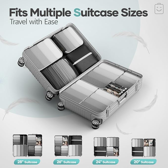 - All-in-One Organization for Your Travel Needs - This 11-piece set includes six compression cubes (S/M*2/L*2/XL) for systematic packing: S for underwear/socks, M for T-shirts and shirts, L for jeans and light sweaters, and XL for coats or bulky items. Also features two PVC toiletry/makeup bags, a machine-washable laundry bag, a shoe bag, and a multi-purpose zippered pouch—keeping your luggage tidy and efficient.