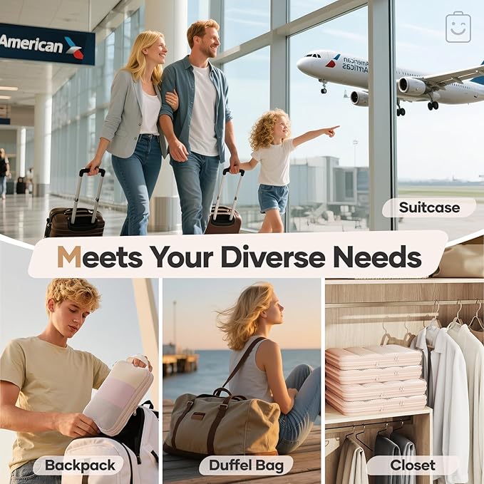 - All-in-One Organization for Your Travel Needs - This 9-piece set includes four compression cubes (S/M/L/XL) for systematic packing: S for underwear/socks, M for T-shirts and shirts, L for jeans and light sweaters, and XL for coats or bulky items. Also features two PVC toiletry/makeup bags, a machine-washable laundry bag, a shoe bag, and a multi-purpose zippered pouch—keeping your luggage tidy and efficient.