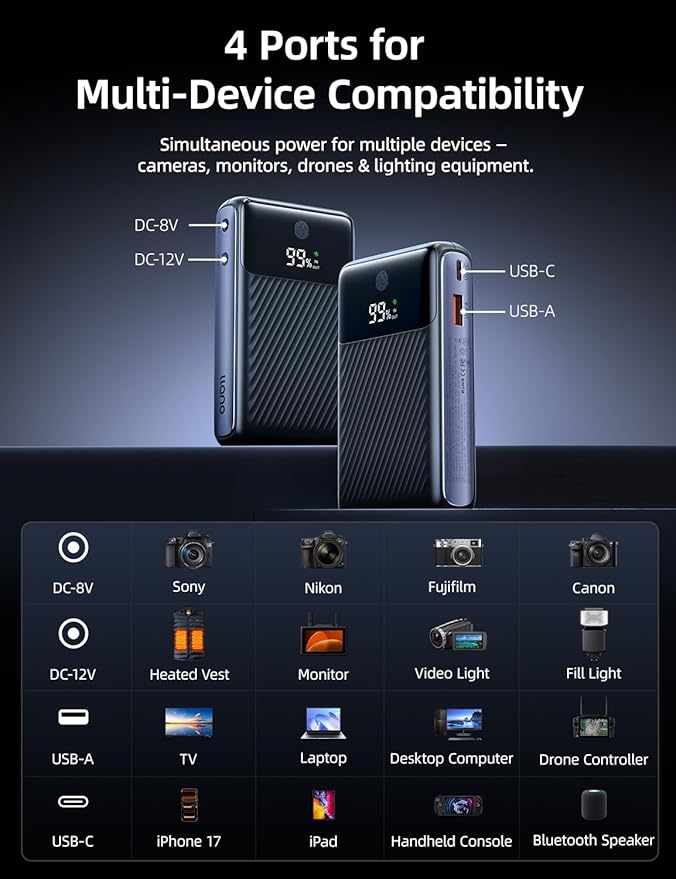 - Stable, Regulated Power in Extreme Conditions: The intelligent voltage-regulation system ensures clean, consistent output that protects sensitive camera electronics during high-temperature shoots or freezing outdoor environments—maintaining reliability where ordinary power banks struggle.