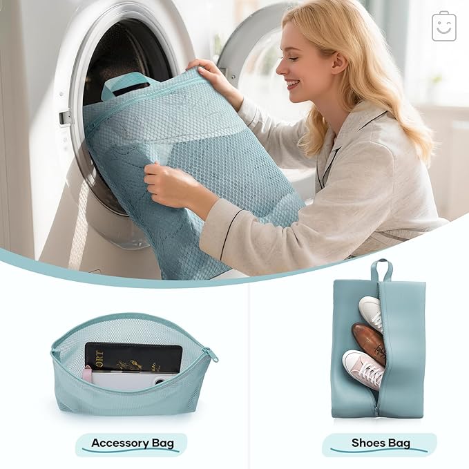 - All-in-One Organization for Your Travel Needs - This 11-piece set includes six compression cubes (S/M*2/L*2/XL) for systematic packing: S for underwear/socks, M for T-shirts and shirts, L for jeans and light sweaters, and XL for coats or bulky items. Also features two PVC toiletry/makeup bags, a machine-washable laundry bag, a shoe bag, and a multi-purpose zippered pouch—keeping your luggage tidy and efficient.