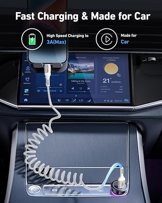 - Coiled USB C Cable: This coiled USB to USB C cable is designed with retractable spring design, no tangle, no knot, not taking up space and easy to carry and use. The automatic rebound design for car charging saves space on the center console and avoids clutter. It is perfectly compatible with Apple's CarPlay and Android Auto, with fast charging and data synchronization.