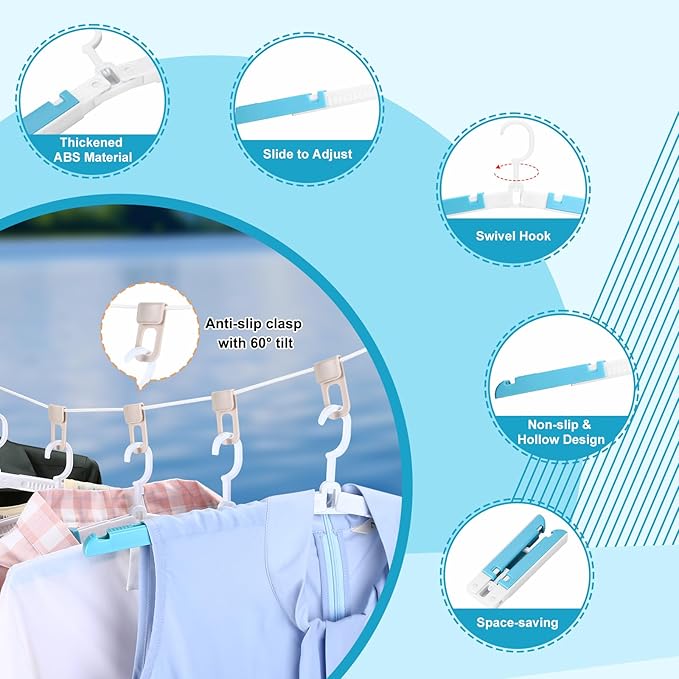- Smart Anti-Slip Design: Unique 60° tilt clips lock hangers on the clothesline, preventing slips even on rough trips. Foldable hangers feature 2 built-in mini clips for socks, strappy tops or gloves—no more mixing items! The 360° swivel hooks are a game-changer for non-traditional setups—easily adjust hanging angles to fit cruise ship cabin lines, camping ropes, or tight portable clotheslines.
