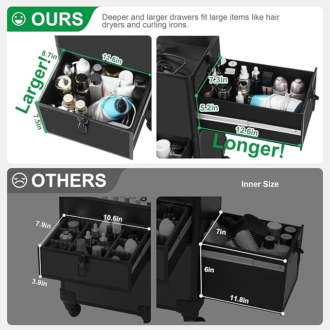 - 【Extra-Large Storage】Both drawers are generously sized to hold larger items like hairdryers and curling irons, while maintaining smooth gliding motion and reinforced durability.