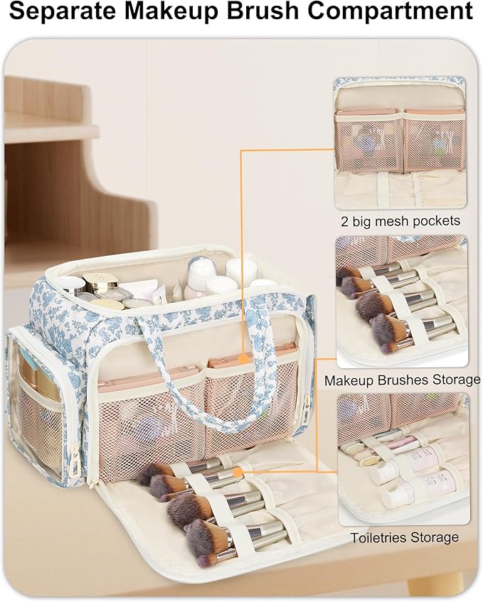 Travel Makeup Bag, Lightweight Wide-open Toiletries Bag for Women, Large Cosmetic Organizer Bag with Makeup Brushes Compartment for Travel-Sized Essentials for Trip, Camping - Blue Flower