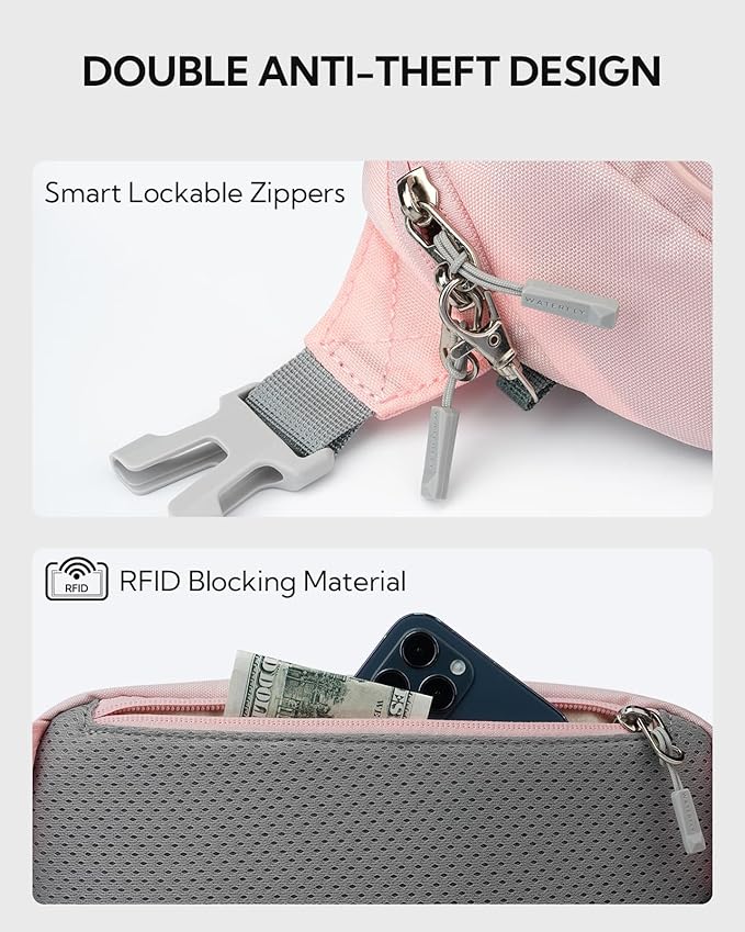 • Dual Anti-Theft Protection – Features a lockable front zipper and a hidden rear pocket lined with RFID-blocking material. Safeguards your phone, cards, passport, and cash from both physical pickpockets and digital threats while you're on the move.