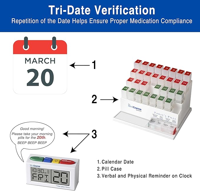 MedCenter 31-Day HSA/FSA Monthly Pill Organizer System with Talking Reminder Clock, Travel Pouch & Tweezers – 4 Daily Dose Compartments – Ideal Medication Organizer for Seniors & Low Vision Users