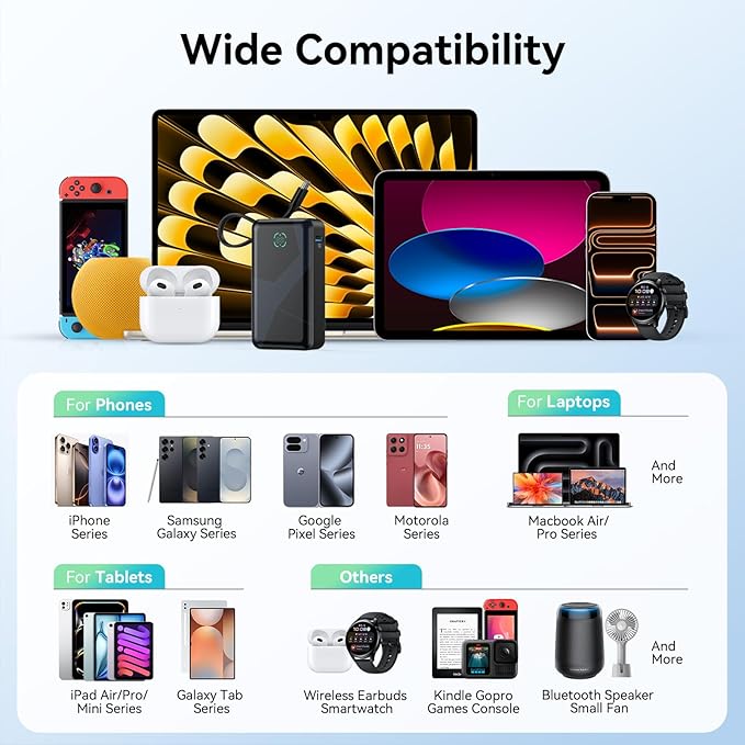 - PD30W Fast Charging: Need power, now? Get it. Support PD 3.0, the power bank can power up your iPhone 16 from 0% to 60% in about 30 minutes. With universal compatibility, it seamlessly powers iPhone, Samsung, Google Pixel, iPad, tablets, smartwatches, cameras and more, so you can save time and stay ahead without limits
