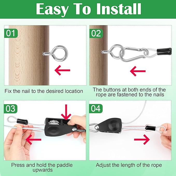 - Versatile Setup for Indoor or Outdoor Use: Designed for versatile installation, the kit features threaded hooks that easily attach to balconies, trees, tents, RVs, or posts. Setup is straightforward, making camping clothesline retractable ideal for both home use and mobile outdoor adventures.