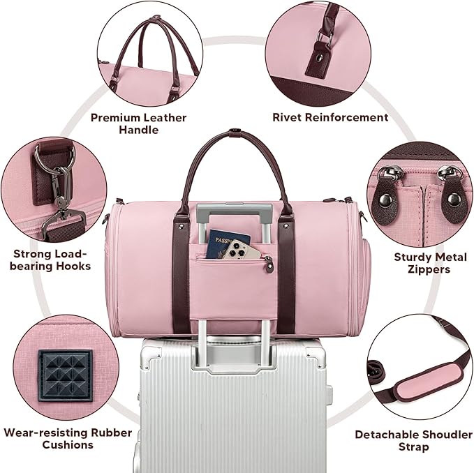 - 【2-in-1 Convertible Function】 Travel in style with our convertible garment duffel bag that provides the convenience of a hanging garment bag along with the functionality of a duffel bag. Features a detachable shoulder strap and trolley sleeve for carrying by hand, over the shoulder, across the body, or attached to luggage. It folds flat for easy storage when not in use.