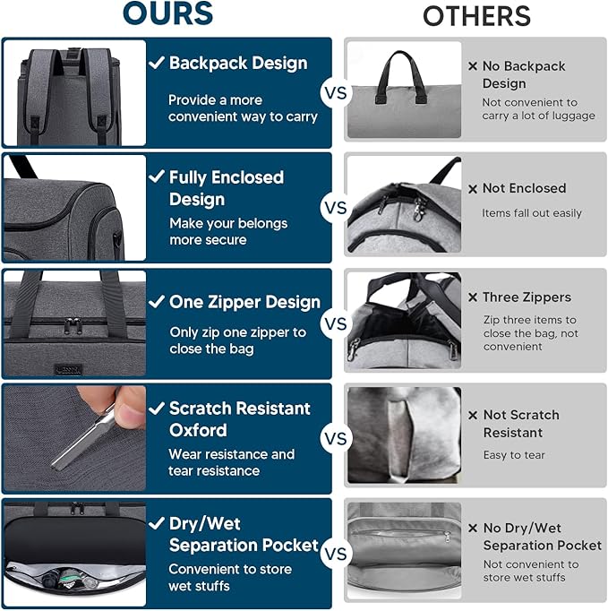 - 【4-in-1 Convertible Garment Bag】 A design that combines the characteristics of garment bags and duffle bags, convertible into tote, shoulder bag, casual bag, or backpack. Use it as a spacious and fashionable fitness, weekend or travel bag or unzip it fully as a hanging suit organizer. Perfect for business trips, vacations, or weekend getaways!