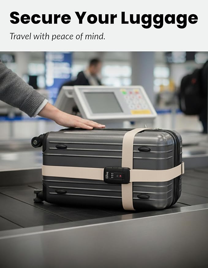 - TSA-Approved 3-Dial Combination Lock: Each strap comes with a reliable TSA-approved 3-digit lock, allowing airport security to inspect without damaging your luggage. Protects your valuables while meeting travel safety regulations and ensuring smooth, hassle-free airport experiences worldwide.