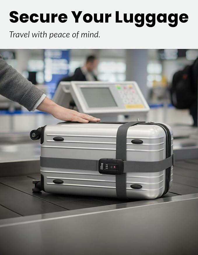 - TSA-Approved 3-Dial Combination Lock: Each strap comes with a reliable TSA-approved 3-digit lock, allowing airport security to inspect without damaging your luggage. Protects your valuables while meeting travel safety regulations and ensuring smooth, hassle-free airport experiences worldwide.