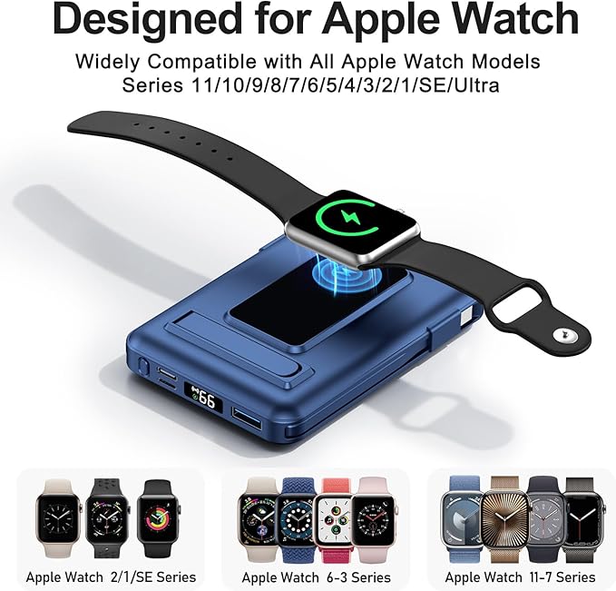 - Wireless & Wired Charging Flexibly: Equipped with 2 Magnetic Wireless charger for Magsafe Charging both iPhone and Apple Watch, USB-C In&Out Ports Support 20W PD Wired Fast Charging, Up to Charge 6 Devices Simultaneously. Use Pass-Through Technology to charge iPhone, Apple Watch while recharging the power bank