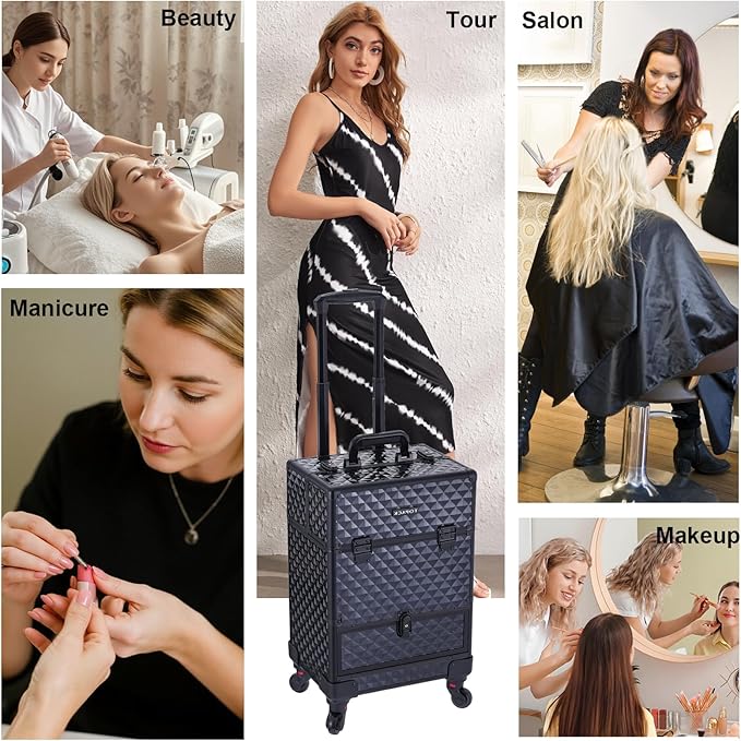 - 【STURDY & STABLE ROLLING MAKEUP CASE】:A-grade aluminum and metal enhance the edges and corners, and the improved middle corner strengthens the strength again, making it have excellent wear resistance and drop resistance. The aluminum tie rod is thickened, the tie rod is smooth and not easy to shake, and the external material is waterproof and corrosion-resistant, making it an excellent protector for outdoor cosmetics.