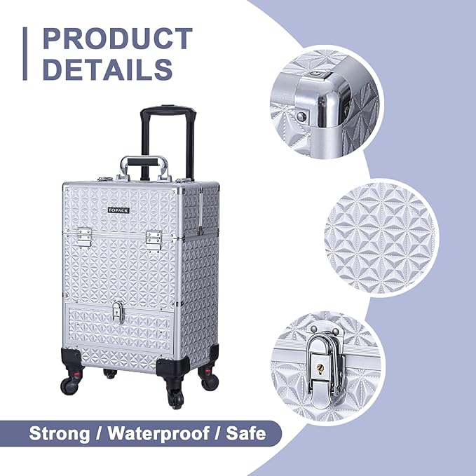 - 【STURDY & STABLE ROLLING MAKEUP CASE】:A-grade aluminum and metal enhance the edges and corners, and the improved middle corner strengthens the strength again, making it have excellent wear resistance and drop resistance. The aluminum tie rod is thickened, the tie rod is smooth and not easy to shake, and the external material is waterproof and corrosion-resistant, making it an excellent protector for outdoor cosmetics.