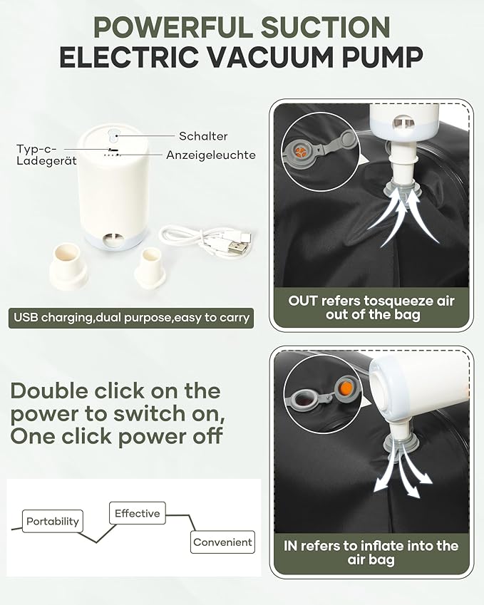 - Vacuum system: We're including an electric vacuum pump with every purchase. (Charge cable included) .Press the switch on the electric pump twice, and it will spring into action immediately, rapidly removing air from the bag. Its powerful suction ensures a tight vacuum seal is achieved in no time which drastically reduces the volume of your stored items.Once you're finished, a single press of the switch turns the electric pump off.
