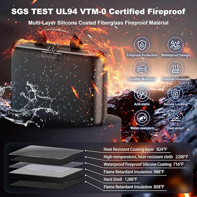 - UL-94 VTM-0 Certified Fireproof Box: HIBWN Fireproof document box is made of high quality flame retardant fiberglass, passed UL-94 VTM-0 professional fire resistance combustion test, with superb fire resistance. Surface used waterproof silicone coating, ensuring that your documents and valuables are protected in case of fire, flood or wet weather.