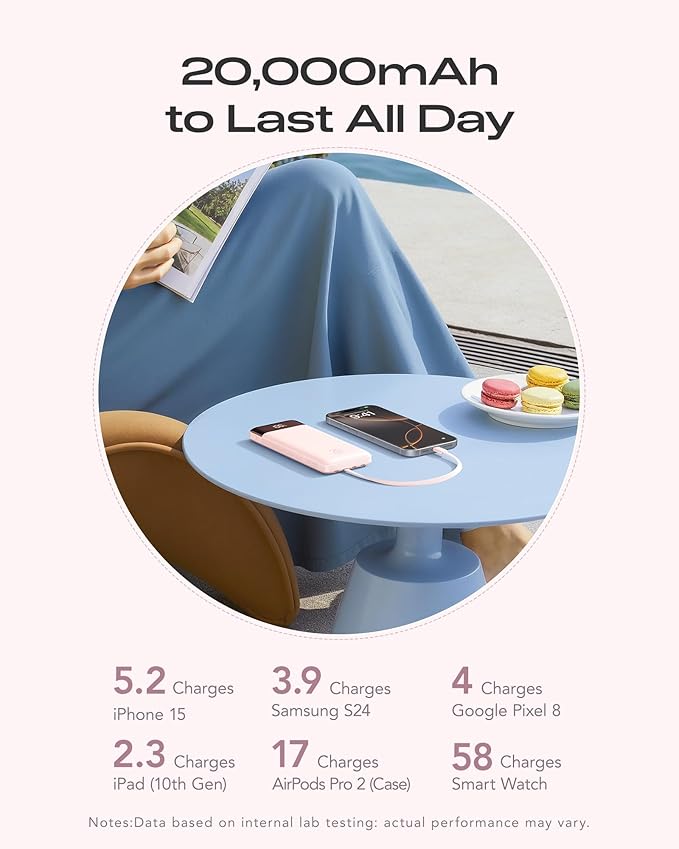 - đDouble the Capacity, JUST 35% HEAVIER: With twice the capacity of standard power banks, this 20,000mAh portable charger with built-in cords powers an iPhone 16 up to 3 times, Galaxy S24 up to 2.9 times, and Google Pixel 9 up to 2.3 times, perfect for weekends away, business trips, or vacations.(Note: This 77Wh power bank complies with airline carry-on regulations for batteries under 100Wh and must be placed in carry-on baggage.)