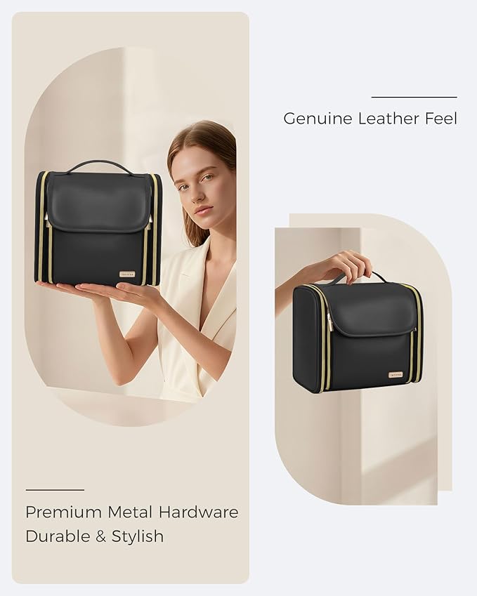- 【Premium PU Leather Fabric】Crafted PU leather polyester, this Leather make up bags for women PVC lining is waterproof and easy to clean, features elastic straps to secure bottles upright and items neatly organized.