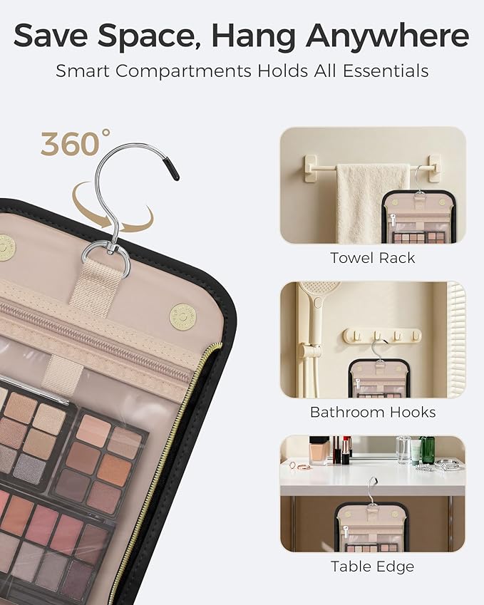- 【Instant Access Hanging System】The 360° rotating hook works on cruise ship bathrooms, gym lockers, or dorm doors. Travel hanging toiletry bag has a U-shaped double zipper design, so you can simply hang the bag on a towel rack or hook and grab your items in mid-air without having to unzip it all the way.
