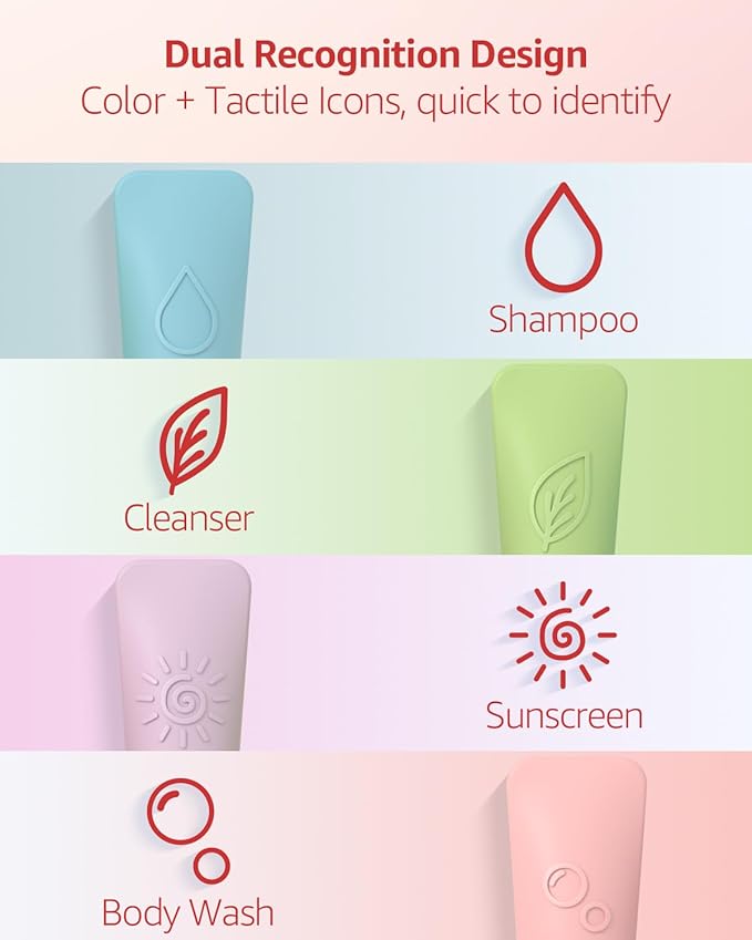 - Tactile Icons – Identify by Touch Raised icons help you quickly recognize contents like shampoo or sunscreen — even in the shower or with eyes closed.