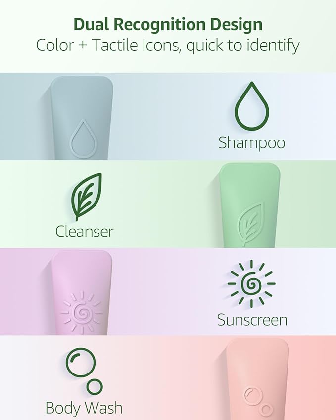 - Tactile Icons – Identify by Touch Raised icons help you quickly recognize contents like shampoo or sunscreen — even in the shower or with eyes closed.