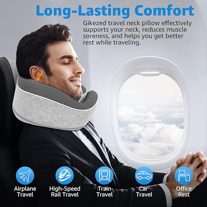 - Ultimate Comfort for Long Travel - Provides comfort for stiff necks. Gikezed memory foam travel pillow provides 360° ergonomic support to help you rest better during flights, road trips, or train journeys.