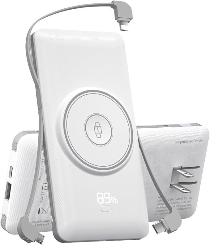 - Build in Cable and Wall Plug:Recharge the portable charger in two ways, built-in AC wall plug for a full charge in 3-4 hours, or use the Type-C (PD20W) port in 2.5-3 hours. At the same time, it comes with 3 different charging cables. You can charge different models of iOS or Android devices simultaneously. No matter where you go, you no longer need different generations of plugs and charging cables!