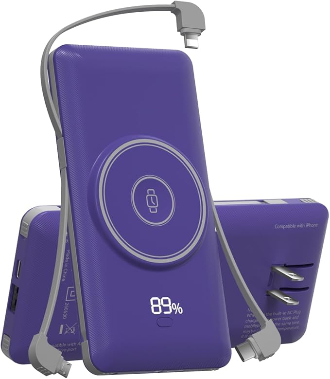 - Build in Cable and Wall Plug:Recharge the portable charger in two ways, built-in AC wall plug for a full charge in 3-4 hours, or use the Type-C (PD20W) port in 2.5-3 hours. At the same time, it comes with 3 different charging cables. You can charge different models of iOS or Android devices simultaneously. No matter where you go, you no longer need different generations of plugs and charging cables!