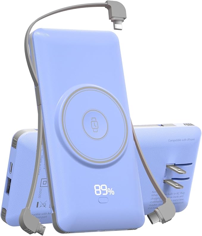 - Build in Cable and Wall Plug:Recharge the portable charger in two ways, built-in AC wall plug for a full charge in 3-4 hours, or use the Type-C (PD20W) port in 2.5-3 hours. At the same time, it comes with 3 different charging cables. You can charge different models of iOS or Android devices simultaneously. No matter where you go, you no longer need different generations of plugs and charging cables!