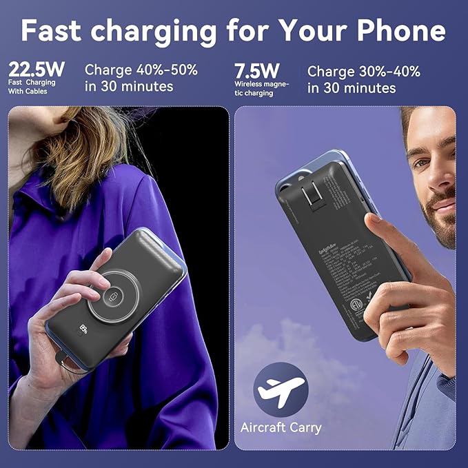 - High-Speed Wireless & Wired Charging: Max 15W Wireless and 22.5W USB-C & Self-Cable Fast Charging. Tested to deliver 2.5 full charges for iPhone 16 Pro and 1.5 charges for 16 Pro Max, 12-15 charges for Apple Watch S10 by Wireless charging. If you charge with the cable that comes with the power bank, you can charge 16pro 3 times and the 16pro max 2.2 times. Max 15W wireless charging refuels 50% in 30 mins, 7.5W wireless charging refuels 30% in 30 mins, 22.5W PD wired charging hits 70% in 35 mins. No inflated specs—honest power for all-day adventures.