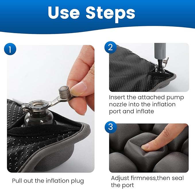 - 【Fully Adjustable Comfort】: Manual pump and mouth-type inflation port enables 3-second set up to inflate or deflate the cushion and easily adjust the firmness of the cushion, Quick inflation or deflating using, ensuring the perfect comfort level for your needs