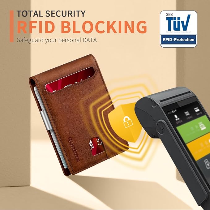 - 𝐑𝐅𝐈𝐃 𝐀𝐧𝐭𝐢-𝐓𝐡𝐞𝐟𝐭 𝐒𝐄𝐂𝐔𝐑𝐈𝐓𝐘 - this slim wallet for men equipped with German Instiute Certified RFID Security technology, a unique metal composite, engineered specifically to block 13.56 MHz or higher RFID signals to protect the valuable information and privacy