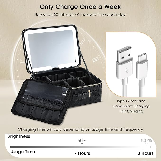 - 【ONLY CHARGE ONCE A WEEK 】- The LED mirror is equipped with a built-in 2000mAh battery, alleviating concerns about battery life during use. Based on an average daily makeup time of 30 minutes, it typically requires charging only once a week. It is important to note that charging duration may vary depending on usage time and frequency.