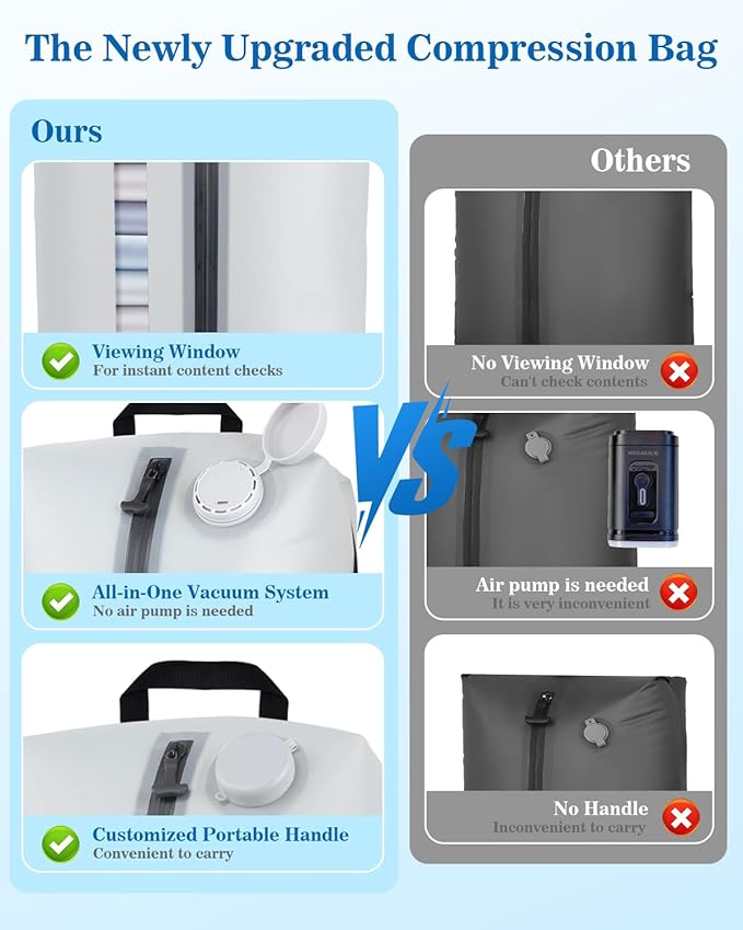 - 【Direct-Power Pump, No Battery Needed】Our Compression Bags has no internal battery and not require charging —simple to use: just seal the zipper, open the protective cover, and connect it to any Type-C device at home. Press the pump button to start immediately. After pumping, securely close the seal cap to prevent air leakage. (If pumping is slow with one device, try another—compatible with over 95% of Type-C devices)