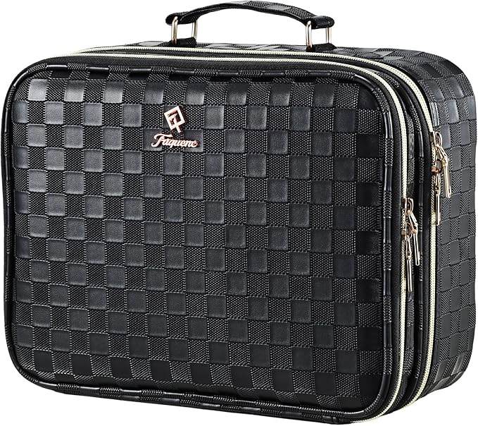 - 【HIGH-QUALITY TRAVEL COSMETIC CASE 】- The Faquenc makeup bag features a stylish black checkerboard pattern and a gold double zipper for easy opening. The handle has been upgraded to an ergonomic, rounded design to minimize strain during use. To accommodate travel needs, a luggage elastic strap has been added for convenient carrying. In addition, a Type-C data cable is included for convenient charging on the go.