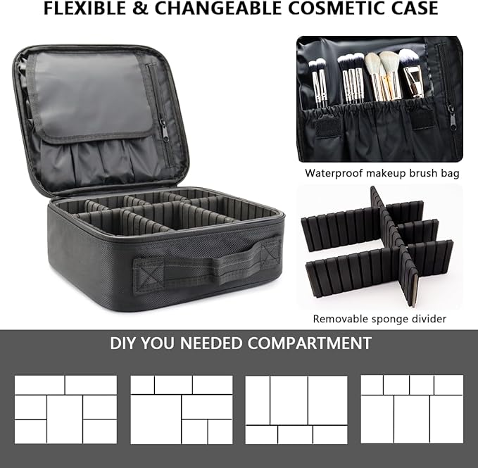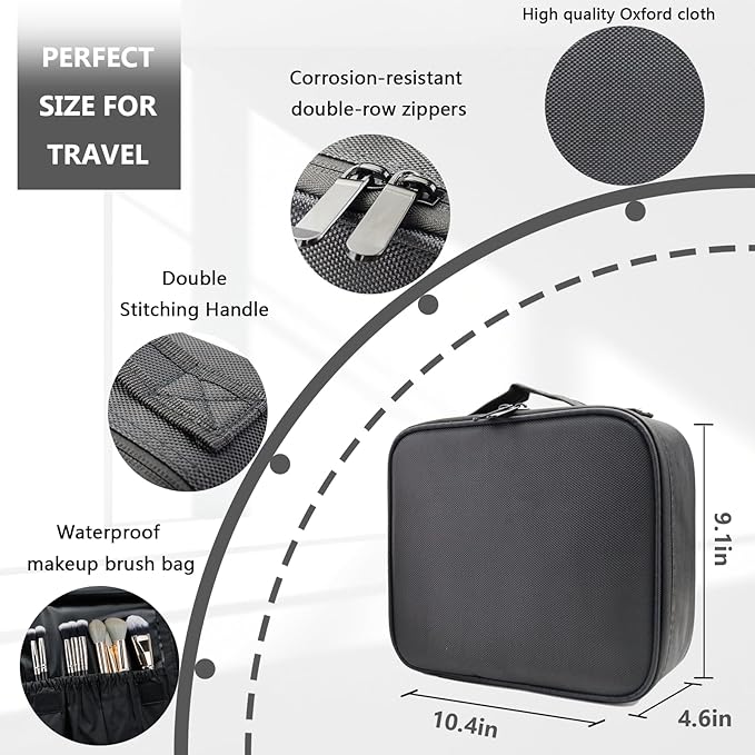- 【Adjustable Dividers & Convenient Size】Large-capacity travel makeup case(10.4"x 9.1"x 4.6") hard partitions and lined surface can be well fixed and protect the cosmetics inside. 6 detachable EVA sponge dividers,you DIY the layout to place nail polish, brushes and other cosmetics in your makeup case as needed.