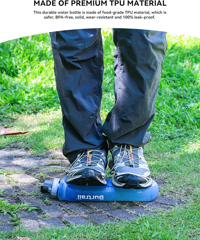 - Long-Lasting & Chemical-Free Filtration: This Burtrail collapsible water bottle is made of food-grade TPU material, the filter cartridge with a lifespan of up to 1,000 liters, this durable filter eliminates the need for purification tablets or chemicals, providing a reliable and eco-friendly hydration solution for extended adventures.