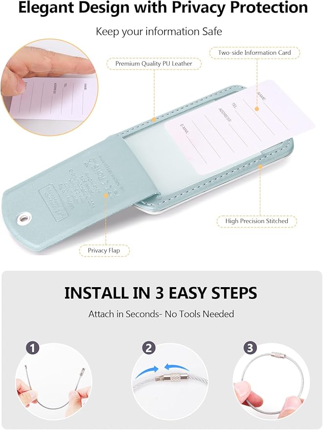- Luxury & Lightweight: Made of high-grade leather and vegetable tanning process, this luggage tag combines luxury with durability. Its hand-stitched edges and anti-scratch coating ensure long-lasting elegance. At just 46g weight, this tag is designed to be slim and lightweight, fitting seamlessly onto your suitcase handle without adding your burden.