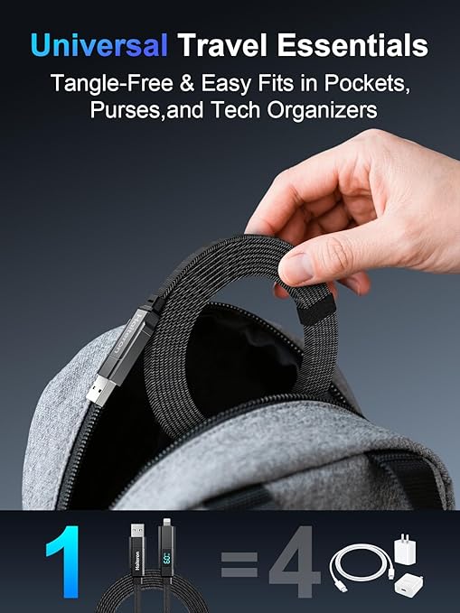 4 in 1 Charging Cable 60W, USB C Fast Charging iPhone Charger Cord Flat Braided Combo USB A/C to C/L Cable with LED Display,Multi Charging Cord for iPhone 16/15,MacBook,iPad,3FT